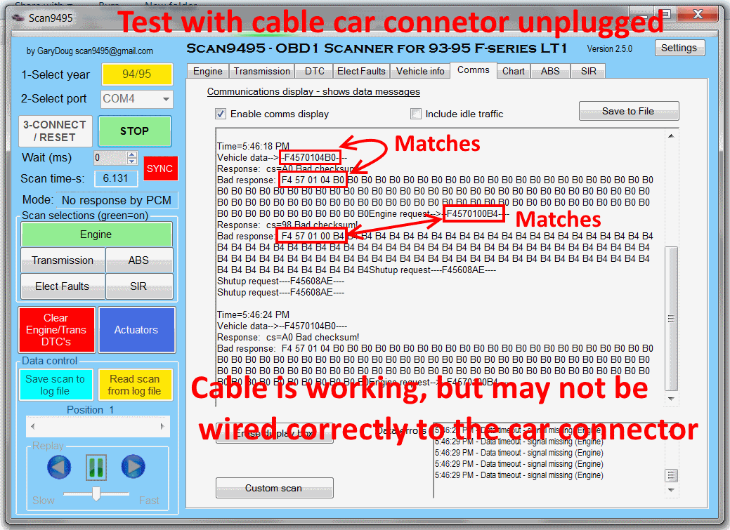 Ok I tried connecting a few times with scan9495 and it is still telling me no sync with PCM. How can I determine if my usb ALDL cable is bad or working? Also the same for the ALDL port under the dash?