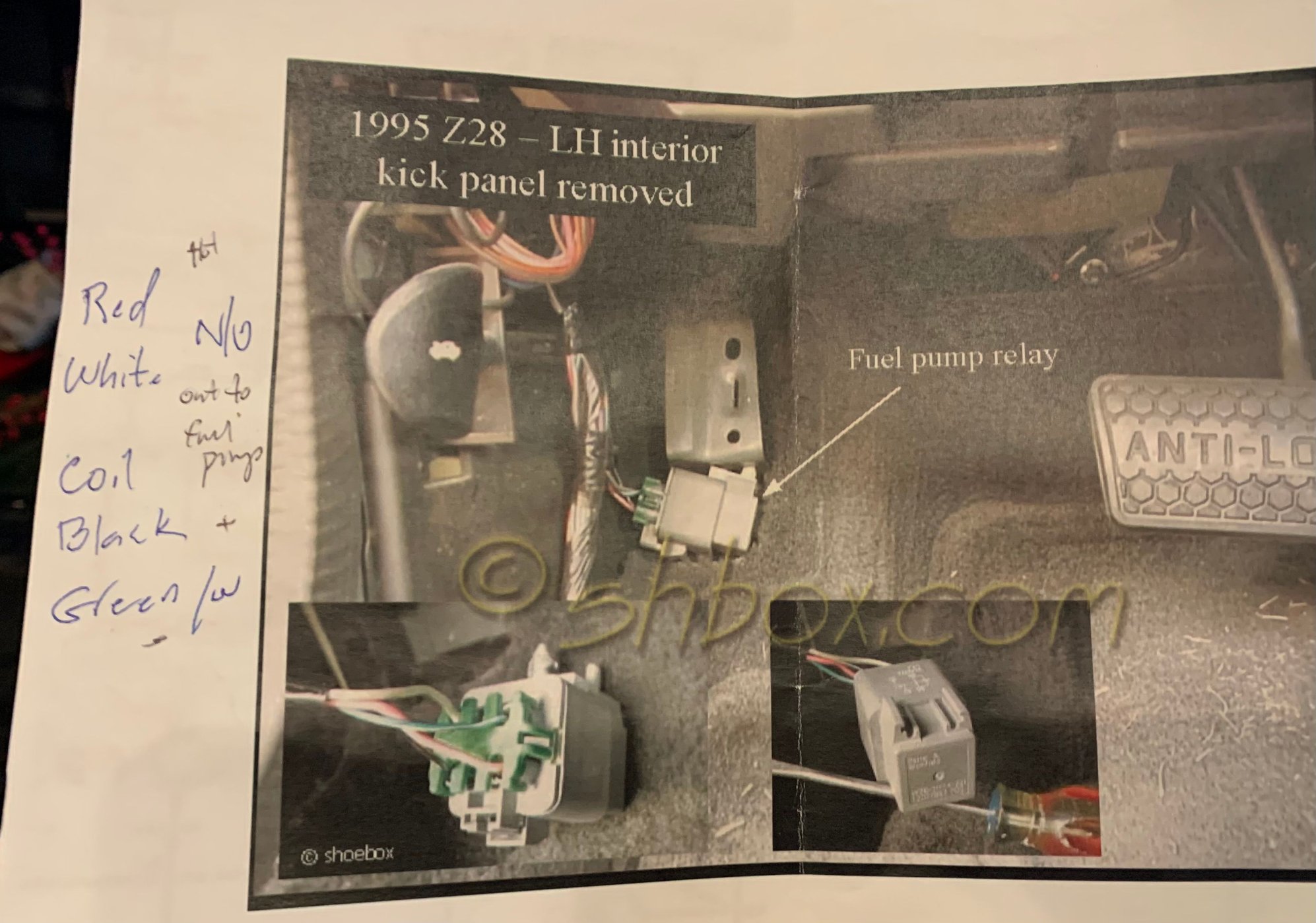 Fuel pump relay checks Body ground to Black 12v for 2sec when key is turned to start Red (12v hot) and white (to fuel pump) are the n/o to the fuel pump. The relay changes state like it should. Let me what you think. Merry Christmas!