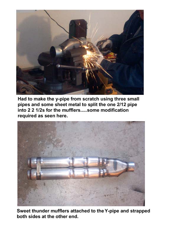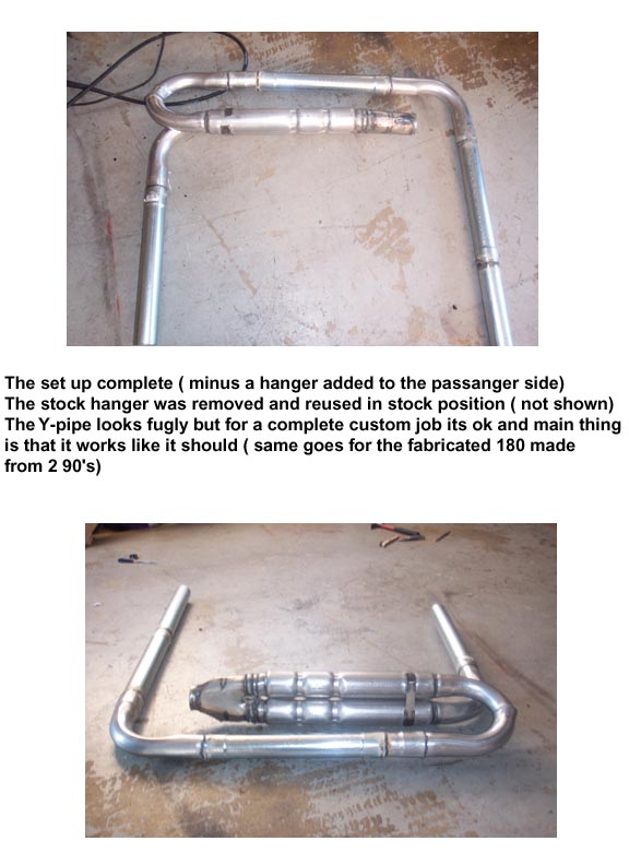 OK......remember that I had NEVER welded anything in my life up until this point and I had to make the Y-pipe from scratch and the 180 bend from 2 90's. A sound file is on its way ( with luck ) will post that tonight.