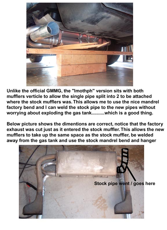 Why go to all of that trouble. If you want a cheeper version of the gmmg why not get the loud mouth. The only differances I see between the gmmg and the loud mouth is the loud mouth has one chamber instead of two and the chamber is in front of the rear end instead od behind it.. The advantages of the loudmouth over what you are doing is 1) the pipes are larger and 2) the bends are more free flowing. Both will give you more hp.