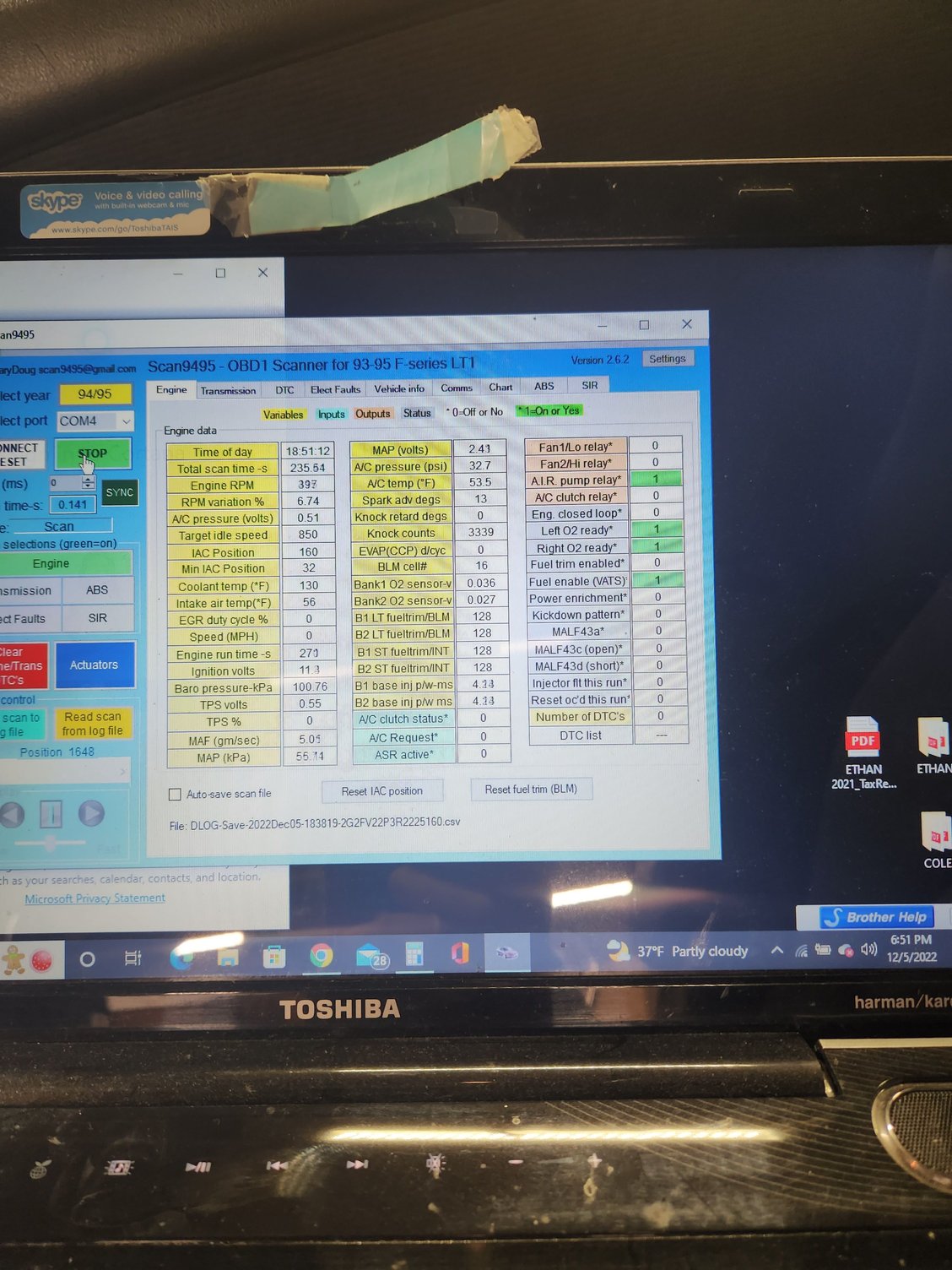 The PCM reads RPM from the Opti cam position sensor pulses. The PCM controls the RPM using the idle air control (IAC). As I pointed out in post #3 the idle RPM is way low compared to the target idle, and the IAC is maxed out at 160 counts. First thought might be that the engine is starving from air, but the high MAP reading (50+ kPa) is possibly due to misfires, preventing the IAC from controlling idle.
