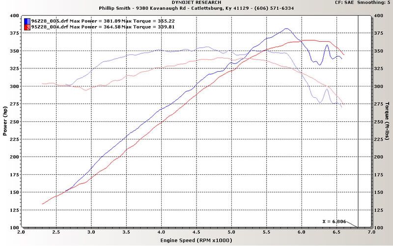 It put down 358/450 @ the wheels. It was full weight, stock salad shooters, exhaust was quiet and ran 11.7's-11.8's@115-116 mph hot lapping the car.