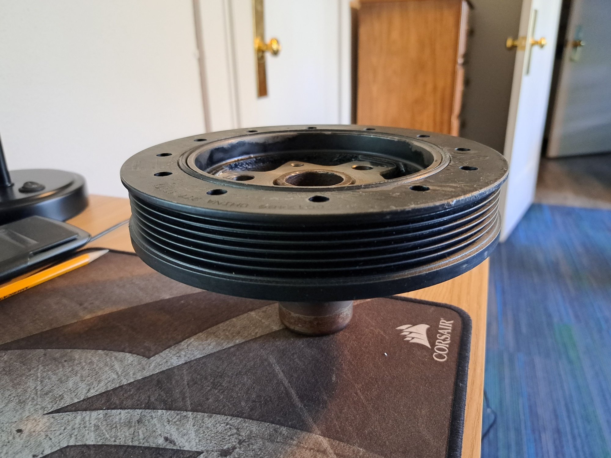 New harmonic balancer Old crankshaft hub (not the one installed on the vehicle currently) New harmonic balancer fits onto the old hub, yet none of the bolt holes align properly Old harmonic balancer, fits onto old hub and the bolt holes align properly