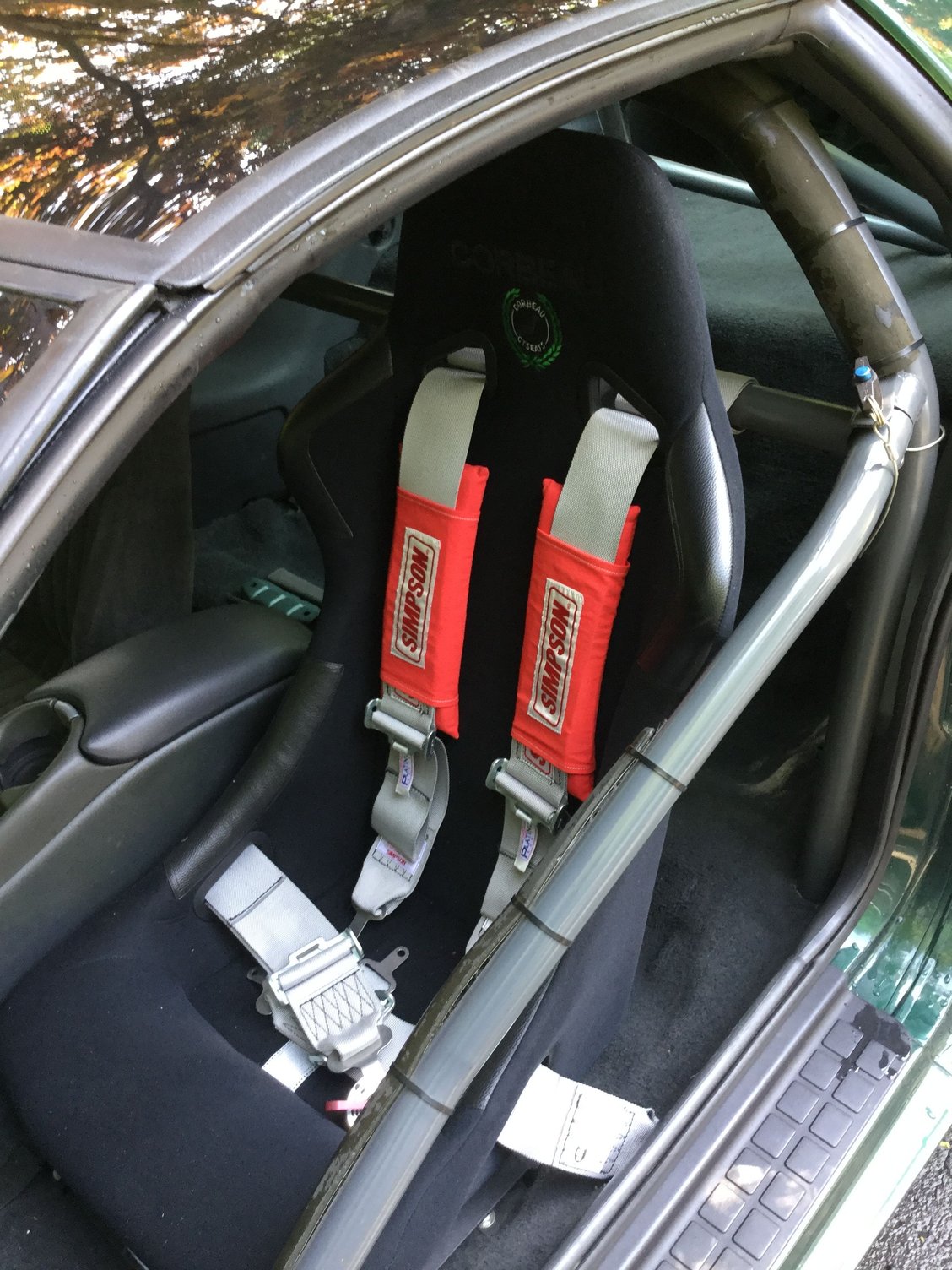 Air bag system has been deactivated. I saw an air bag explode in the racers face on a hard launch at the track. Figured the FIA-certified Corbeau seat, the date-correct Simpson 5-point harness, roll bar with SFI padding, and a Simpson open-face helmet would keep me safe. There was also a 5-point harness for the stock passenger seat.