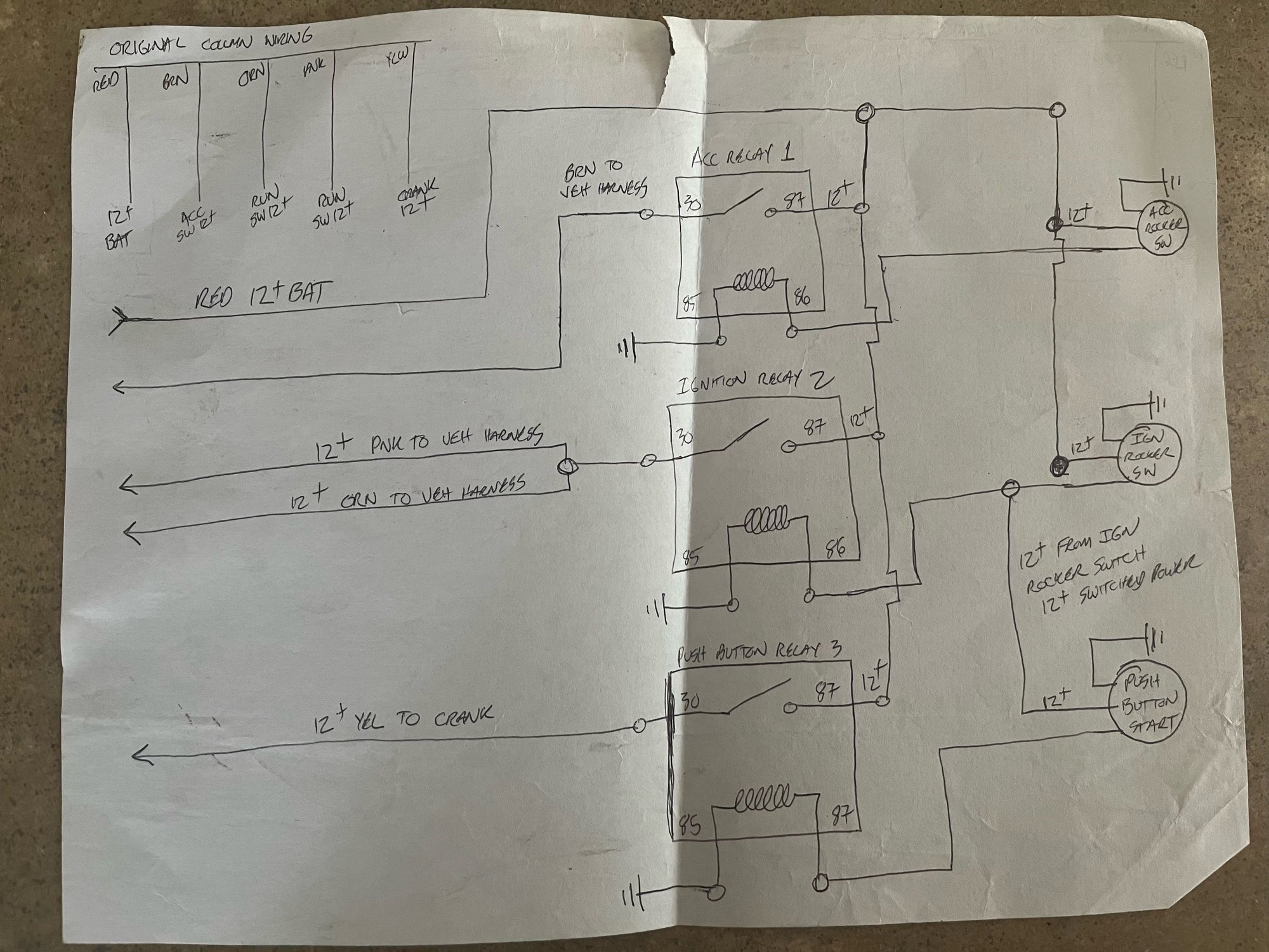 I did a push button start on my '94 many years ago. I tucked this diagram into the Helms manual and managed to actually remember I had it and dug it out. I took the key completely out of the system and used two rocker switches for Accessory and Ignition. I mounted the switches and the starter button in a panel on the center console where the little storage bin was. I used three relays, one for each switch and the start button. The button was from a Honda S2000.