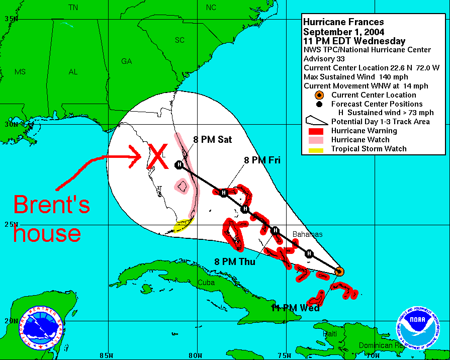 I don't know about you guys, but I'm sh!tting my pants right about now. If this thing stays on its current track, it is going to engulf the entire state almost at once. I don't think anywhere in Florida is safe. Combined with its massive size, the slow speed at which it's moving is very scary. We're talking sustained 100+ winds for HOURS and HOURS, not like 1 hour or 2 from Charley. Also, all the debris laying around the state is going to make for projectile city. I don't know what to do. I'm scheduled to work Friday night, I don't think I'll be going.