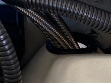 This is where the stainless fuel lines pop out under the frame or out of the frame. Either way you wanna look at it. They’re tucked up underneath where they won’t hang down. Of course they have a clamp to hold them as seen here and other places.